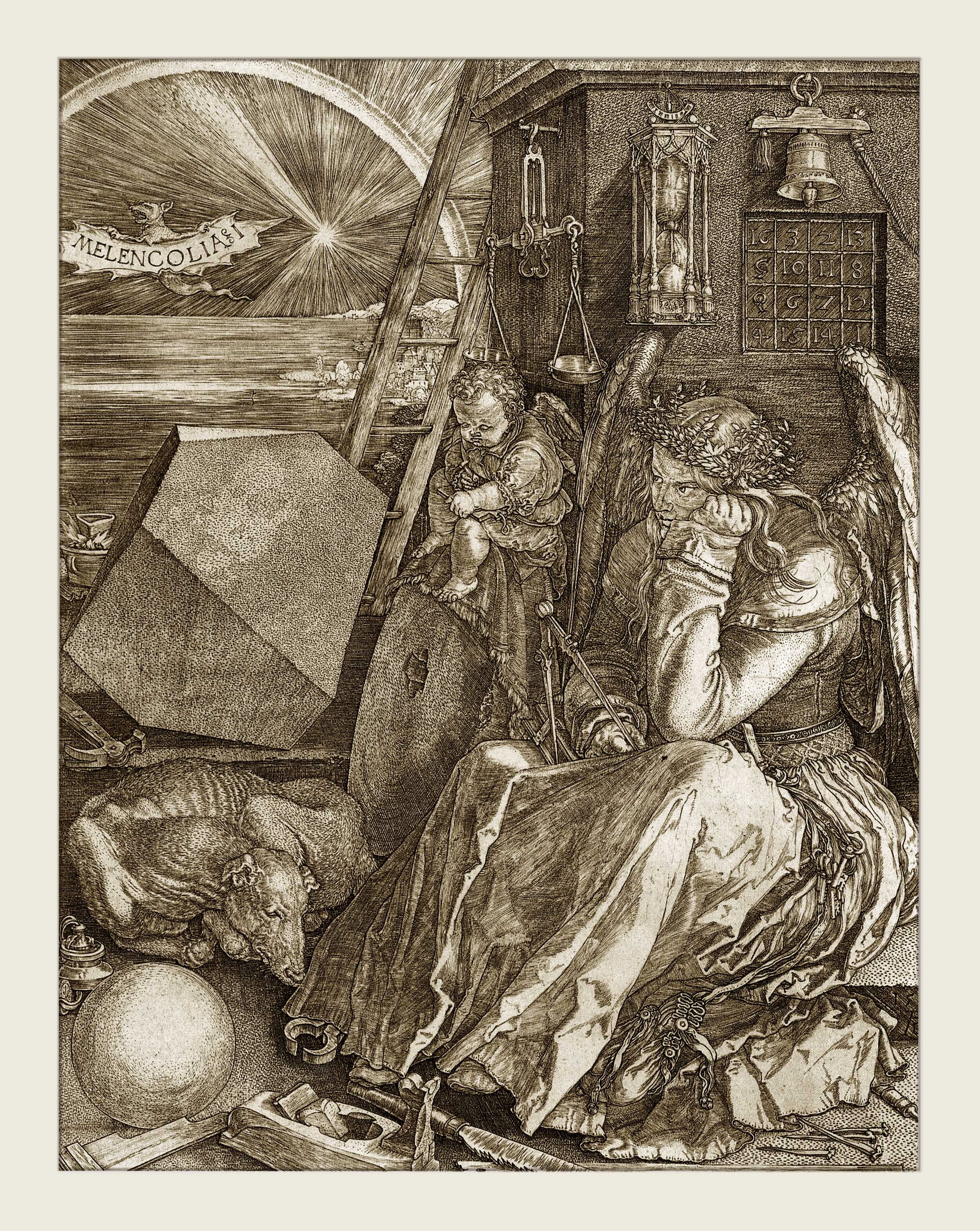 Finally, here is DŸrer's most famous and enigmatic engraving, "Melancolia I" (1514). This is a relatively high resolution image and almost gives you a sense of its presence. Feel free to explore this image, and look for some material about this print on the internet. It has been written about extensively. Notice all the tools, the magic square, the sky... etc. The whole thing is fascinating.